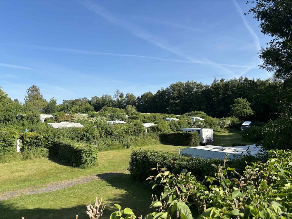 Der Platz ist von hohen Bäumen umgeben und natürlich in verschiedene Zonen unterteilt. Wir wohnten im westlichsten Teil - einem Bereich namens Paradiset, der auf einem Plateau liegt und einen Blick über die verschiedenen Ebenen des Platzes bietet.