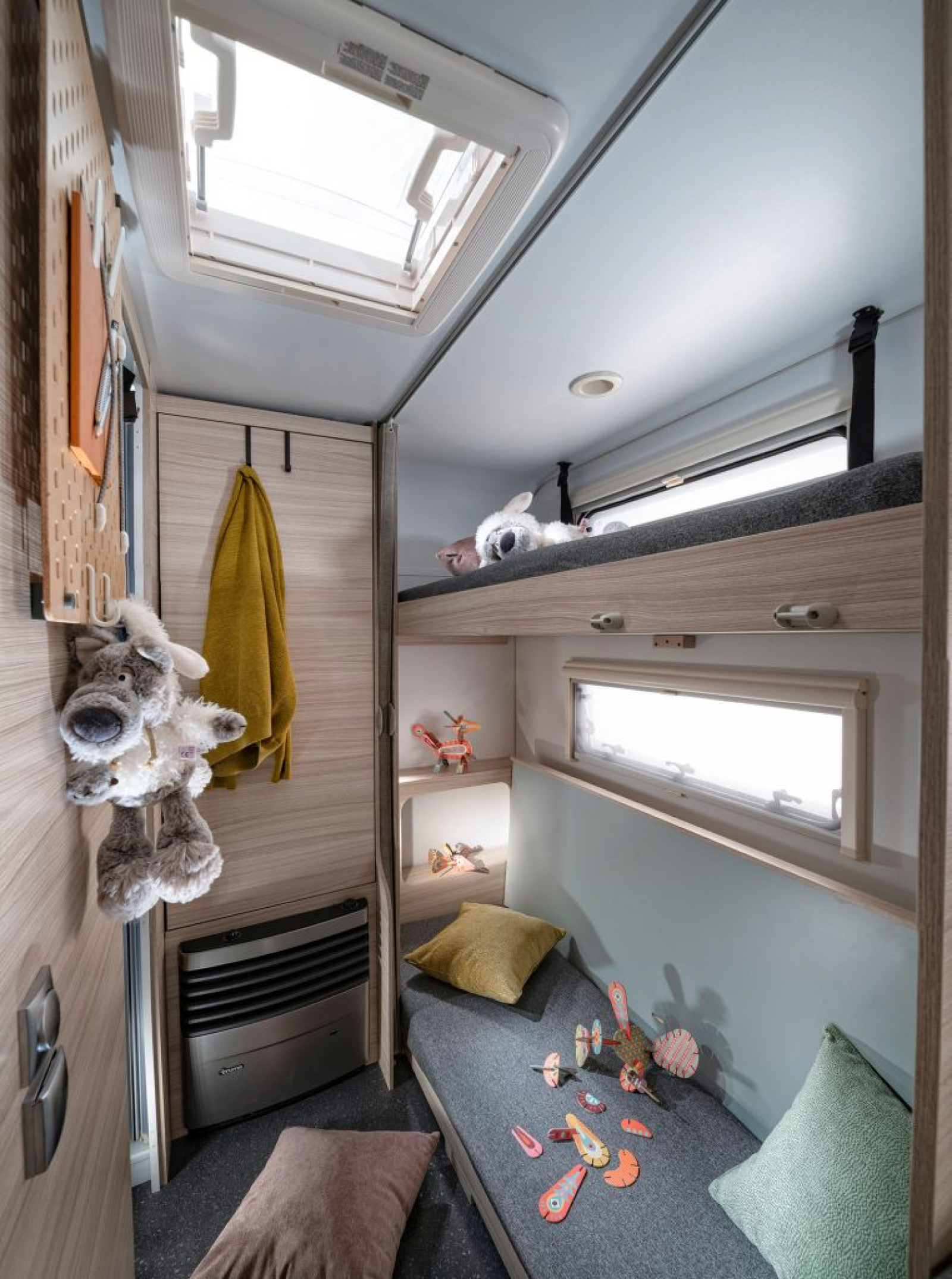 Die Seitendinetten wurden zu „echten“ Rundsitzgruppen umgestaltet… Ausgewählte Oberschränke verfügen über ein zusätzliches Regal… Es gibt nun auch an mehreren Stellen im Wohnwagen Stoffaufbewahrungstaschen – sie sind dekorativ und sorgen für Gemütlichkeit…