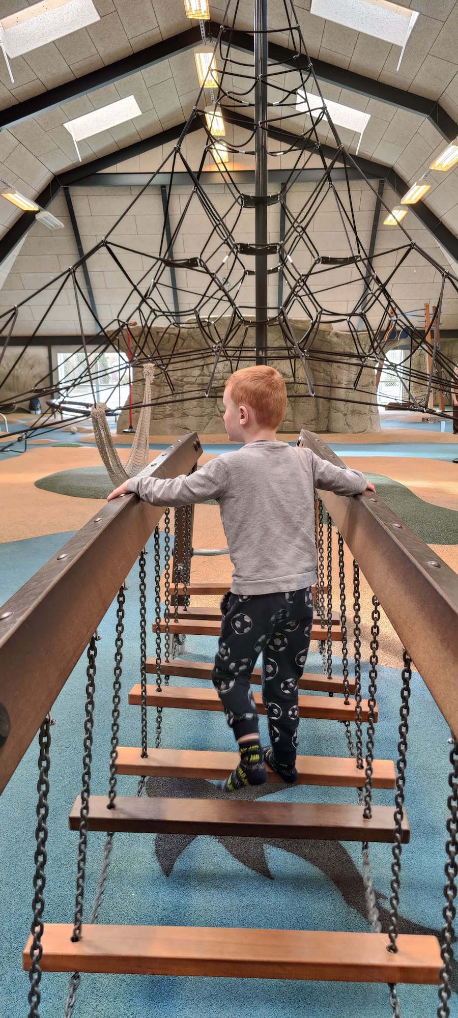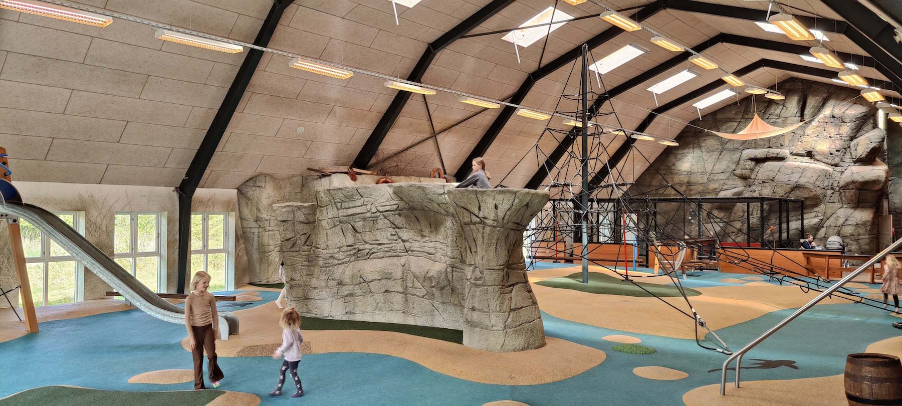 Drinnen findet ihr nämlich ein riesiges Spielparadies mit insgesamt 600 m², mit einem Kletternetz in der Mitte und kleinen "Inseln", zwischen denen die Kinder herumspringen können.