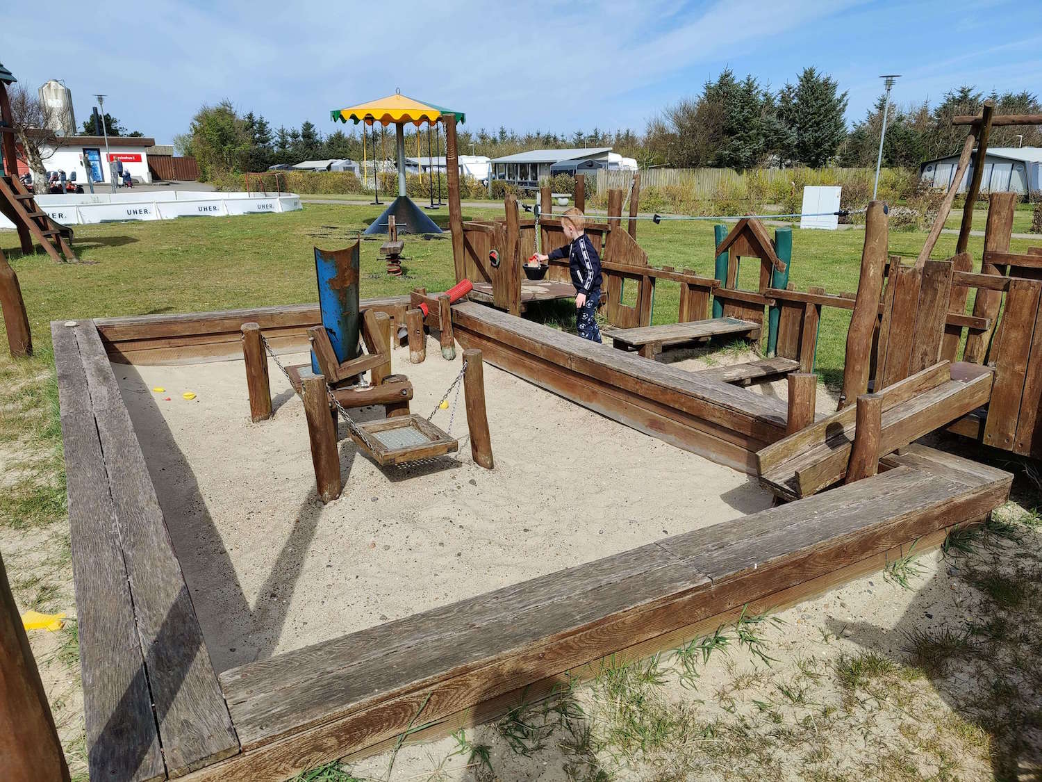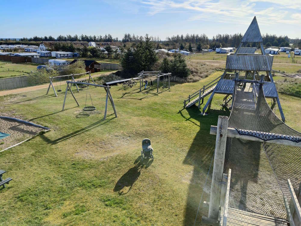 Glücklicherweise für ihn (und uns) lag ein kleiner Spielplatz direkt neben unserem Ferienhaus. In der Nähe der Rezeption gab es einen großen Spielplatz mit Hüpfkissen, einem riesigen Turm und einer langen Seilbahn, die Samuel liebte.