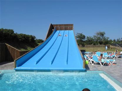 Und tatsächlich ist der 35 Meter hohe Surf-Hügel mit 4 Bahnen der größte auf einem dänischen Campingplatz, aber die über 300 qm große Solaranlage neben dem Poolbereich sorgt dafür, dass die Temperatur im großen Becken selten unter 28° den ganzen Sommer über fällt, und das Kinderbecken ist gut über 30°.