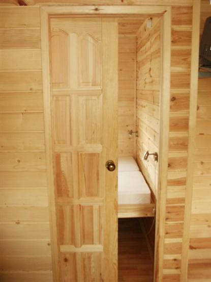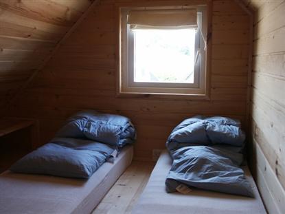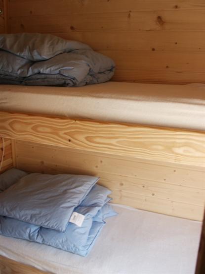 Die Hütte ist aus hellem Holz gebaut und hat eine offene Decke, was sie größer, geräumiger erscheinen lässt und sie angenehm hell und gemütlich macht.