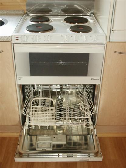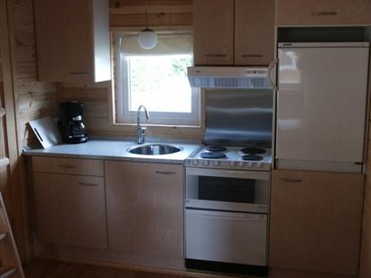 Die Küche ist eingerichtet mit einem Kühlschrank in Stehhöhe, Dunstabzugshaube, Herd mit Kochfeld, Ofen und Geschirrspüler (was auch etwas ganz Neues in den Luxushütten ist). Allerdings gibt es nicht viel Ablagefläche. Es gibt Geschirr für 6 Personen, mit allem, was man gerade braucht.