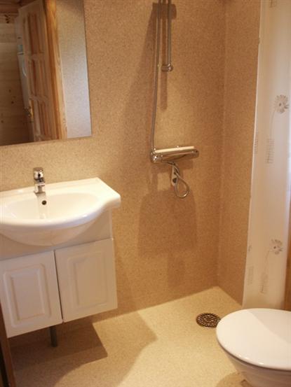 Das Badezimmer ist klein, aber gut genutzt mit Toilette, Möbeln und einer Duschkabine mit Duschvorhang sowie Einbauleuchten, die ein wirklich gutes Licht geben. Es gibt auch ein zu öffnendes Fenster im Badezimmer, sodass man nach dem Baden gut lüften kann.