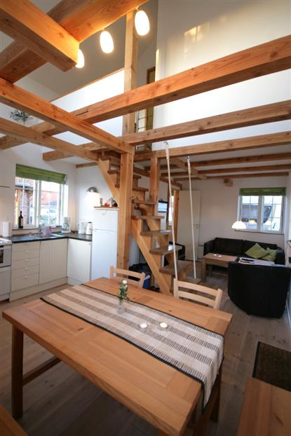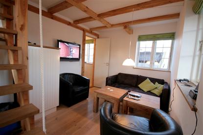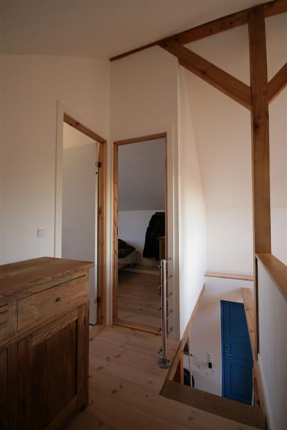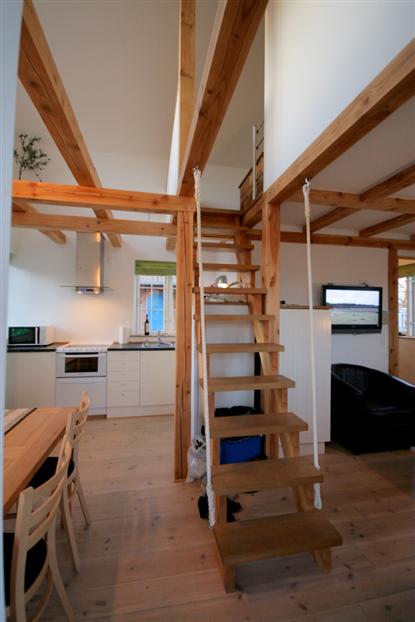 Trotz der Tatsache, dass Campinghütten nur 25 qm groß sein dürfen (es wird derzeit über eine Erweiterung auf 35 qm verhandelt, Anm. d. Red.), gibt es viel Platz. Die Schlafzimmer mit offener Decke wirken geräumig und luftig, und in einem gibt es sogar Platz für eine Kommode zur Aufbewahrung. Vom Dachboden - der Zugang zu beiden Schlafzimmern bietet - hat man einen Blick hinunter durch das Stockwerk ins Erdgeschoss und die Küche. Ein schönes Detail!